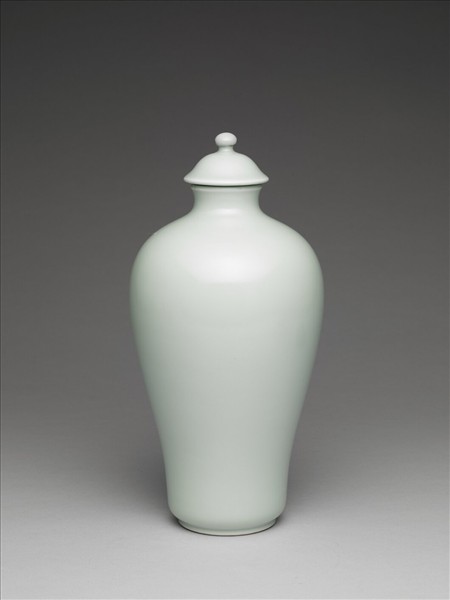 直唇口,短頸,豐肩,腹上豐下斂,近足處一凹棱,平底,淺凹足,帶圓鈕笠形子母口蓋。通體均施青釉,呈粉青色,釉色勻淨淡雅,胎骨勻輕,質堅細膩。底青花書「大清雍正年製」六字雙行雙圓框楷款。雍正時期青釉或青花茶葉罐頗多,可見雍正時期宮廷飲茶風氣之興盛。