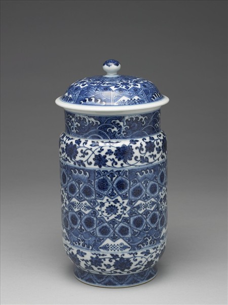 帶蓋白地青花瓷罐,圓口,直頸,折肩,肩甚窄,直腹如筒,圈足。頸部波濤紋。外壁上下各飾一帶纏枝花卉,中央部分等距裝飾數個角星,角星之中繪卷枝花,並將角星外廓直線分別延長,彼此交錯分割出各式幾何區塊,並於幾何區塊中各自填飾大小花卉、葉片、波濤紋。足牆繪飾半邊盛開花朵,其順次排列如覆蓮瓣。蓋外壁裝飾概念與外壁類同,都是以中心向外分割輻出各式幾何形區塊,並以花卉、波濤填飾其中。由其器形與紋樣看來,顯然是模仿自明代初年的青花瓷器(現藏於北京故宮,品名為〈青花錦紋壯罐〉)。學者曾進一步論及這種器形的來源,推定源頭可以追溯至伊斯蘭陶瓷。除此之外,若將其外壁主紋飾與十四世紀敘利亞馬木路克王朝時期〈玻璃金彩唾壺〉外壁紋飾相較,就會發現其裝飾概念類同,特別是〈玻璃金彩唾壺〉幾何區塊中填飾的如花似葉的小紋樣,同見於本器與北京故宮藏品。如此一來,我們就可以瞭解本器樣式、紋飾所模仿的對象與源流,實是明代初年受外國影響所製作的作品。本器雖然無款,但是院藏中見有帶「大清乾隆年製」款的類似作品(典藏號:中瓷5493),且紋飾、釉色高度相似,或可推定本器當製作於清代乾隆朝。