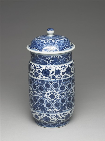 帶蓋白地青花瓷罐,圓口,直頸,折肩,肩甚窄,直腹如筒,圈足。頸部波濤紋。外壁上下各飾一帶纏枝花卉,中央部分等距裝飾數個角星,角星之中繪卷枝花,並將角星外廓直線分別延長,彼此交錯分割出各式幾何區塊,並於幾何區塊中各自填飾大小花卉、葉片、波濤紋。足牆繪飾半邊盛開花朵,其順次排列如覆蓮瓣。蓋外壁裝飾概念與外壁類同,都是以中心向外分割輻出各式幾何形區塊,並以花卉、波濤填飾其中。由其器形與紋樣看來,顯然是模仿自明代初年的青花瓷器(現藏於北京故宮,品名為〈青花錦紋壯罐〉)。學者曾進一步論及這種器形的來源,推定源頭可以追溯至伊斯蘭陶瓷。除此之外,若將其外壁主紋飾與十四世紀敘利亞馬木路克王朝時期〈玻璃金彩唾壺〉外壁紋飾相較,就會發現其裝飾概念類同,特別是〈玻璃金彩唾壺〉幾何區塊中填飾的如花似葉的小紋樣,同見於本器與北京故宮藏品。如此一來,我們就可以瞭解本器樣式、紋飾所模仿的對象與源流,實是明代初年受外國影響所製作的作品。本器雖然無款,但是院藏中見有帶「大清乾隆年製」款的類似作品(典藏號:中瓷5493),且紋飾、釉色高度相似,或可推定本器當製作於清代乾隆朝。