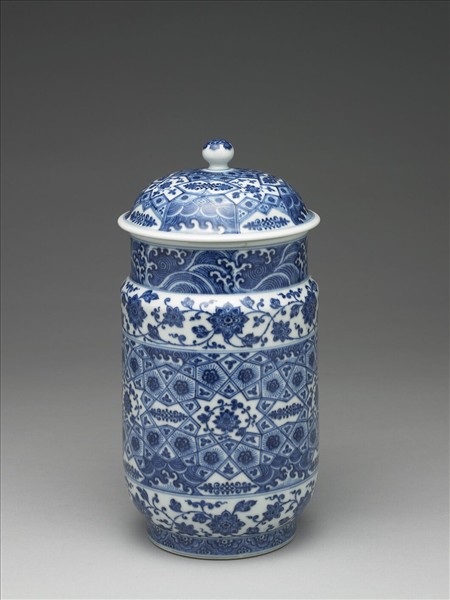 帶蓋白地青花瓷罐,圓口,直頸,折肩,肩甚窄,直腹如筒,圈足。頸部波濤紋。外壁上下各飾一帶纏枝花卉,中央部分等距裝飾數個角星,角星之中繪卷枝花,並將角星外廓直線分別延長,彼此交錯分割出各式幾何區塊,並於幾何區塊中各自填飾大小花卉、葉片、波濤紋。足牆繪飾半邊盛開花朵,其順次排列如覆蓮瓣。蓋外壁裝飾概念與外壁類同,都是以中心向外分割輻出各式幾何形區塊,並以花卉、波濤填飾其中。由其器形與紋樣看來,顯然是模仿自明代初年的青花瓷器(現藏於北京故宮,品名為〈青花錦紋壯罐〉)。學者曾進一步論及這種器形的來源,推定源頭可以追溯至伊斯蘭陶瓷。除此之外,若將其外壁主紋飾與十四世紀敘利亞馬木路克王朝時期〈玻璃金彩唾壺〉外壁紋飾相較,就會發現其裝飾概念類同,特別是〈玻璃金彩唾壺〉幾何區塊中填飾的如花似葉的小紋樣,同見於本器與北京故宮藏品。如此一來,我們就可以瞭解本器樣式、紋飾所模仿的對象與源流,實是明代初年受外國影響所製作的作品。本器雖然無款,但是院藏中見有帶「大清乾隆年製」款的類似作品(典藏號:中瓷5493),且紋飾、釉色高度相似,或可推定本器當製作於清代乾隆朝。