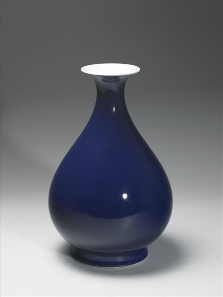 玉壺春式瓶,撇口,細頸,斜肩,梨形碩腹,圈足。器身施霽青釉,靛藍光亮,器裡與底白釉。圈足露白胎,底青花書「大清雍正年製」雙行六字楷款,外加雙圈。