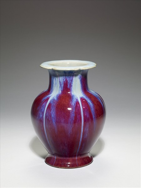 六瓣花形口,寬直頸,圓肩,鼓腹,圈足外撇。器表有六道棱紋,與花口呼應。通體施鈞紅釉,呈紅、靛、紫、月白等多色深淺混雜流動窯變釉。器底施醬釉,底心印「大清乾隆年製」六字三行篆款,圈足露胎,塗赭色汁。