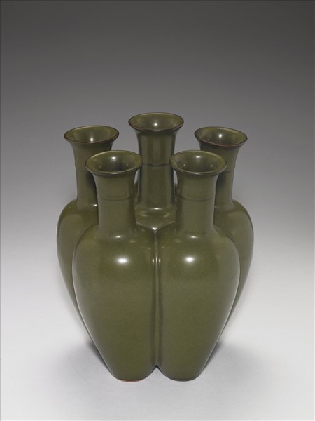 整器以五個撇口,直頸,廣肩,長削腹的相同造形瓶子均衡地圍著中間頸稍長的主瓶相連在一起,成為造形相當特殊的六連瓶。六個瓶肩都一般高,六個瓶底齊平、大小相同。五個外圍相連的瓶壁露出的面積相同,在五個相連瓶壁內成虛體相通無隔,中間主瓶則由肩而下至足鑽數個洞孔為實體,與外五瓶相通。此件茶葉末釉色呈綠,口緣及頸中間具裝飾性的凸弦紋,釉薄呈黃褐色。圈足底露胎,圈足內有釉。中間主瓶圈足內,以陽文印「大清乾隆年製」六字篆款。