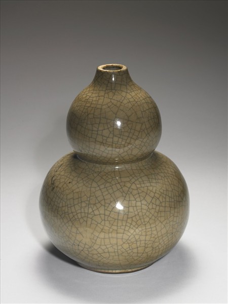 葫蘆瓶,小圓口,葫蘆狀器身,圈足。全器滿釉,釉色灰黃,器表滿佈細碎網狀開片。足露胎無款,足內塗褐色汁無款,有七小點釉如支丁痕。