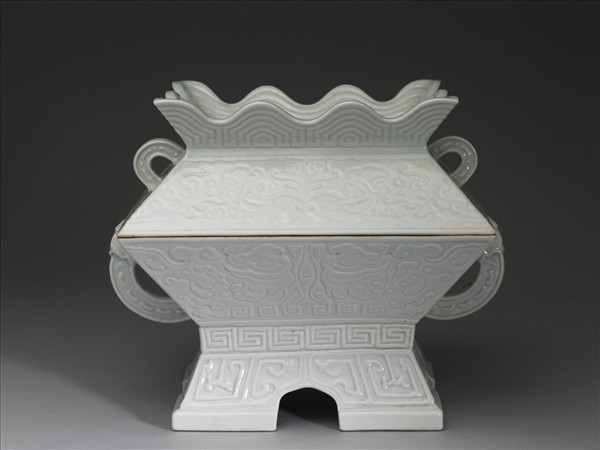 瓷簠,仿古造形,形式見於《皇朝禮器圖式》。器作方形,有蓋,器蓋上窄下寬,器身上寬下窄,皆作梯形,方足外撇。全器外壁以印花為飾,蓋面飾夔龍,蓋頂斜出棱,呈波狀邊緣,棱內飾水波紋,外飾曲線紋;腹作夔龍紋,束脛為回紋,足壁為雲紋;蓋與器皆有雙耳,半環形,蓋耳飾如意點,器耳附以夔龍紋。雙耳及內底外側均有細支釘痕,即燒造時在足圈之外還需有兩層支釘支撐,才能維持其外型。施青白釉,惟足底及外底露胎呈灰白色,由於其釉色白中泛青,應是用於祭夕月壇的月白色釉簠。蓋內及底外中央各刻有「大清乾隆年製」六字三行篆款。