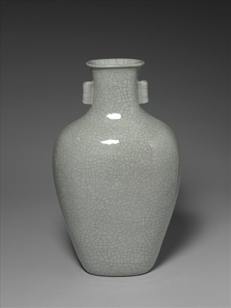 唇口外侈,直頸,雙貫耳,豐肩,腹漸斂,器身呈扁瓶形,圈足。外壁施仿官釉,色灰青,並滿布冰裂紋。足緣露胎一圈塗褐色汁,足內滿釉,釉下青花書「大清乾隆年製」三行六字篆款。