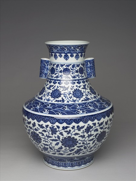 侈口,長頸,折肩,肩下斜收,外撇形淺圈足。頸部設雙貫耳。通體飾青花。侈口,雙貫耳、折肩處及足脛皆飾海水江牙紋。頸上、下及折肩以下各式如意雲頭紋飾之。自貫耳處至腹部,分三層以各式番蓮、纏枝花卉飾之。足脛飾以變形蕉葉。足底青花「大清乾隆年製」六字三行篆書方款。