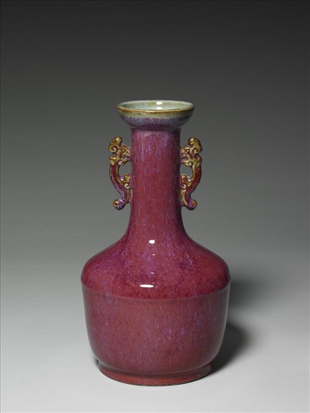 盤形口,直長頸,斜肩,直壁斂腹,雙龍耳,圈足。器外滿施爐鈞釉,這種仿鈞窯變釉,是雍正時出現的新品種,係仿鈞釉色繁衍而來,採多次施釉,燒成過程中,不同金屬元素自然結合。所產生的流動窯變釉色,一般偏紅者,稱「火焰紅」。口沿與雙耳邊均帶褐色邊。足緣露胎,圈足內底施薄釉,底有「雍正年製」雙行陰刻篆書款。