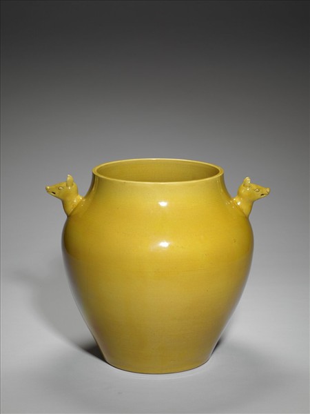 敞口罐,腹部上廣下削,平底淺凹,全器光素,僅肩上雙耳小獸形,器內外滿覆黃釉,底外有「大清乾隆年製」三行六字篆款,故知為此器為清代乾隆朝之製作。由於乾隆朝成書的《皇朝禮器圖式》卷一之中,其〈社稷壇正位尊〉、〈地壇正位尊〉與本器相類,且明言其為瓷質、黃色,故知本器為乾隆朝所使用的祭器。存世亦見有施紅釉、白釉者,亦可經由《皇朝禮器圖式》的載錄,得知其對應使用的祭祀場合。此外,明代弘治朝亦有類似器存世。