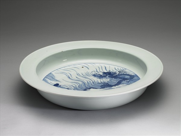 洗,侈口,折沿有邊棱,淺直壁,平底。於內底圓框中以青花繪鯉魚躍龍門圖案。全器罩透明釉,外底露胎呈白色,中央以青花書「大清康熙年製」六字雙行楷款,外加雙圈。
