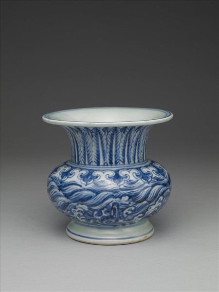 花囊,器仿青銅器尊形,侈口,斂頸,扁圓腹,圈足外撇,平底呈內凹三階式。胎骨厚重,青花呈色濃豔,有深褐色結晶疵斑,上罩泛青白釉。頸繪飾蕉葉紋,中莖留白,兩側葉脈鈷藍平染。肩畫十二如意雲頭紋一周,腹飾仙山福海,以青花表現皴法及藍地白濤潮水紋,其下畫卷渦紋一圈。器外底心有弦紋兩道,底書青花「大明宣德年製」雙圈雙行六字楷款。足底露牙白色胎,餘施白色薄釉。