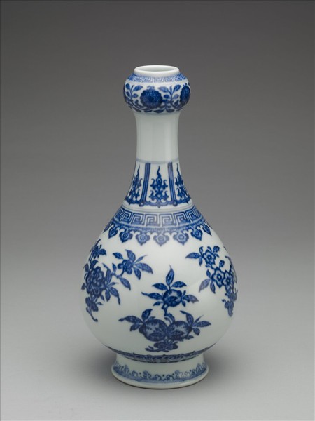 蒜頭瓶,作蒜頭小口,束頸,溜肩,碩腹,圈足外撇。外壁以青花繪飾圖樣。口沿回紋,蒜頭壁繪卷枝花。頸部上半段留白,下半段覆蓮瓣,蓮瓣內飾有火焰狀之雲紋。頸腹交接處飾回紋、如意雲紋。腹外壁的主紋飾為折枝花果,這些折枝花果的下方主枝均見靈芝生長。腹外壁近底處門字形蓮瓣,足牆外波濤紋。足緣露胎一圈,足內青花書「大清乾隆年製」三行六字篆款。