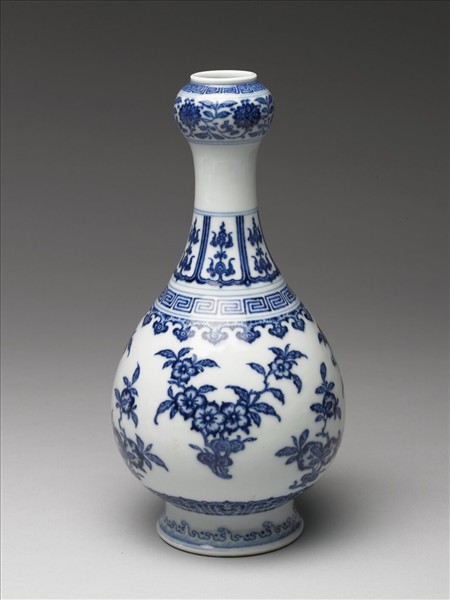 蒜頭瓶,作蒜頭小口,束頸,溜肩,碩腹,圈足外撇。外壁以青花繪飾圖樣。口沿回紋,蒜頭壁繪卷枝花。頸部上半段留白,下半段覆蓮瓣,蓮瓣內飾有火焰狀之雲紋。頸腹交接處飾回紋、如意雲紋。腹外壁的主紋飾為折枝花果,這些折枝花果的下方主枝均見靈芝生長。腹外壁近底處門字形蓮瓣,足牆外波濤紋。足緣露胎一圈,足內青花書「大清乾隆年製」三行六字篆款。