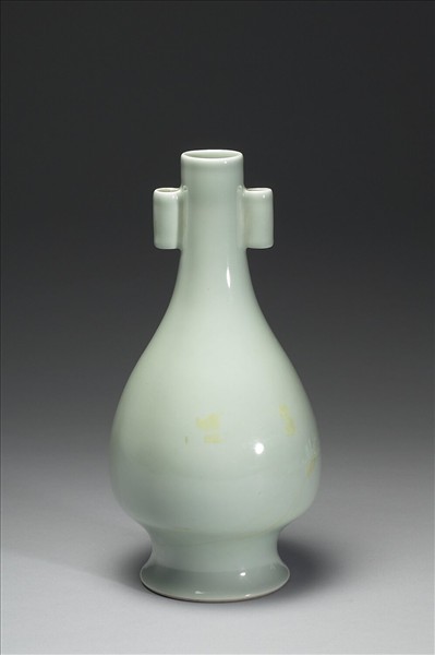 小口,直長頸,垂腹,斂脛,淺圈足。通體施汝釉,色淡青瑩潤,光素無紋。圈足露白胎,底心青花書「大清雍正年製」三行六字篆款。