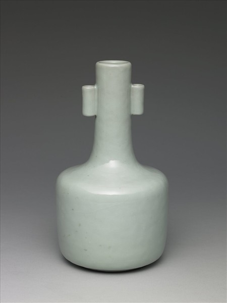 圓口,長頸,折肩,圓腹,矮圈足,雙貫耳。通體施汝釉,色青瑩潤,光素無紋。圈足露胎,塗赭色汁,底心青花書「大清乾隆年製」三行六字篆款。