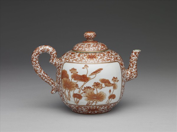 斂圓口,弓形把,曲流,圓頂蓋,蓋側一通氣孔。通體礬紅描繪纏枝番蓮紋,腹部兩面開光,一面繪荷塘蓮花,一面書乾隆題詩:「秋荷葉上露珠流,柄柄傾來盎盎收。白帝精靈青女氣,惠山竹鼎越窯甌。學仙笑彼金盤妄,宜詠欣茲玉乳浮。李相若曾經識此,底須置驛遠馳求。」「荷露烹茶一律,乾隆己卯新秋御製」,硃紅「比德」、「朗潤」二印。蓋面畫轉枝番蓮紋,鈕面繪盛開蓮花一朵,鈕側則飾朵花一周。蓋足外壁塗金外,內面全施綠彩。器底礬紅書「大清乾隆年製」六字三行篆款。 壺上詩文為乾隆二十四年(1759)秋天所作,詩題為〈荷露烹茶〉(載於《乾隆御製詩》二集卷八十八),這年秋天乾隆皇帝駐蹕園明園,此詩應是園內荷亭烹茶時有感而作,而後命人題寫於壺上;同時燒製的還有與壺成套的描紅荷花茶碗,碗上亦題有相同詩文。