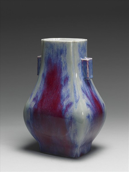 瓶侈口,雙貫耳,斜肩,方形腹,方形圈足。四角之口至肩部有楞紋,腹部前後各施一凸起杏葉紋飾。通體施爐鈞釉,呈紅、靛、紫、月白等多色深淺交匯流動的窯變釉。器底施醬釉,底心印「大清乾隆年製」六字三行篆款,圈足露胎,塗赭色汁。雍正仿鈞釉作品,採多次施釉,燒成過程中,不同金屬元素自然結合,所產生的流動窯變釉色,偏紅、紫色系者,有「玫瑰紅、海棠紫及驢肝、馬肺」之稱。