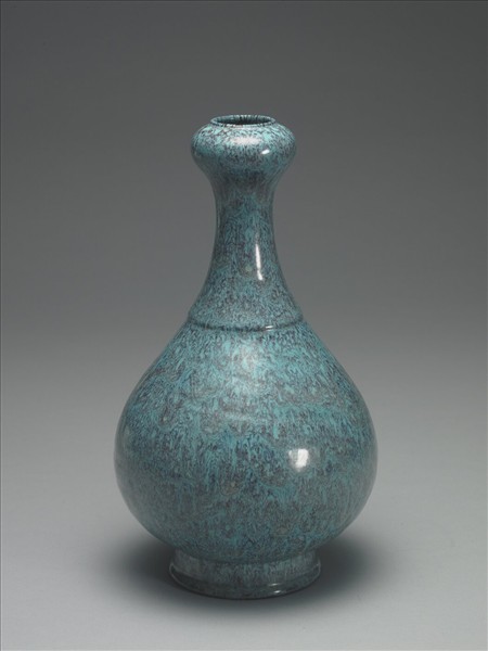 蒜頭口,長頸,碩腹,圈足。外壁滿施仿鈞釉,呈現深、淺藍色流淌交融的乳湯狀效果。足緣露胎一圈,塗褐色汁,足內滿釉,中心釉下模印「雍正年製」雙行四字篆款。