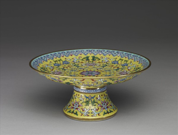 敞口,弧壁下斂,高足外撇,有如觚形器之脛部。內外壁黃地,以多彩釉繪飾紋樣。器內外壁以纏枝番蓮花葉為主要裝飾圖樣。內底盤心作俯視盛開花狀,並由此花為中心,周繞四朵略小的側視盛開纏枝番蓮花,這四朵番蓮花蔓生勾連的花葉,滿布盤內隙地。外壁與足牆,都是等距繪飾纏枝番蓮花,再由番蓮花所蔓生的花葉填滿隙地。除此之外,口緣、足牆皆見有描金絃紋,既模仿了金屬琺瑯器露胎的效果,也增添了富麗堂皇氣象。足內滿施湖綠釉,中心紅彩書「大清乾隆年製」三行六字篆款。