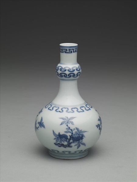 直口,長頸,上有一凸棱,斜肩,圓腹,圈足。以青花為飾,口飾回紋,凸棱處繪如意紋雙圈。腹上下各飾一圈如意紋,中央繪折枝石榴及桃實,口緣、凸棱及腹上下與圈足處各繪兩道弦紋。足底露胎,呈白色,底書「大清雍正年製」雙行六字楷款,外圍雙圈。