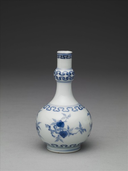 直口,長頸,上有一凸稜,斜肩,圓腹,圈足。以青花為飾,口飾回紋,凸棱處繪如意紋雙圈,腹上下各飾一圈如意紋,中央繪折枝石榴及桃實,口緣、凸稜及腹上下與圈足處各繪兩道弦紋。足底露胎,呈白色,底書「大清雍正年製」雙行六字楷款,外圍雙圈。