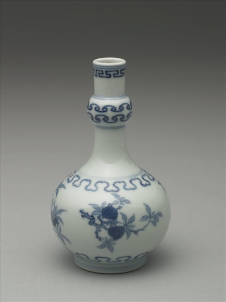 直口,長頸,上有一凸稜,斜肩,圓腹,圈足。以青花為飾,口飾回紋,凸棱處繪如意紋雙圈,腹上下各飾一圈如意紋,中央繪折枝石榴及桃實,口緣、凸稜及腹上下與圈足處各繪兩道弦紋。足底露胎,呈白色,底書「大清雍正年製」雙行六字楷款,外圍雙圈。