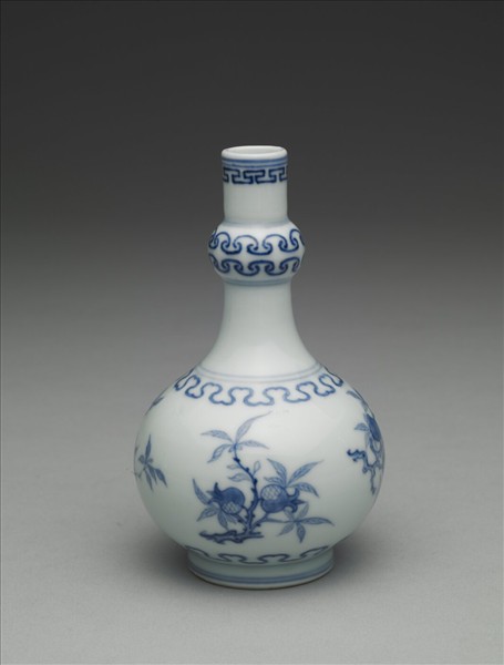 直口,長頸,上有一凸棱,斜肩,圓腹,圈足。以青花為飾,口飾回紋,凸棱處繪如意紋雙圈,腹上下各飾一圈如意紋,中央繪折枝石榴及桃實,口緣、凸棱及腹上下與圈足處各繪兩道弦紋。足底露胎,呈白色,底書「大清雍正年製」雙行六字楷款,外圍雙圈。