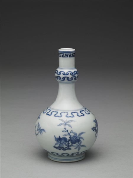直口,長頸,上有一凸棱,斜肩,圓腹,圈足。以青花為飾,口飾回紋,凸棱處繪如意紋雙圈,腹上下各飾一圈如意紋,中央繪折枝石榴及桃實,口緣、凸棱及腹上下與圈足處各繪兩道弦紋。足底露胎,呈白色,底書「大清雍正年製」雙行六字楷款,外圍雙圈。
