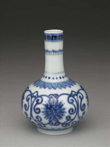 直口,長頸,圓腹,圈足。外壁以青花為飾,口沿繪幾何紋一圈,頸中有兩道波浪紋,下垂直線紋,如流蘇一般;頸下緣繪點紋一圈,腹部中央以如意雲紋圍成四開光,開光內各繪一朵番蓮紋,上下各繪蕉葉紋一圈。足底緣露胎,呈白色,底以青花書「大清雍正年製」雙行六字楷款,外加雙圈。