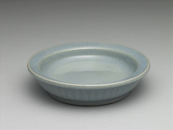 敞口,折沿,窄唇,淺壁,圈足,外壁有凹凸菊瓣棱紋。全器施仿汝青釉,釉色天青,晶瑩潤澤片,釉面佈滿淺褐色開片紋。足底緣塗護胎汁,呈褐色,底以青花書「雍正年製」雙行四字篆款。