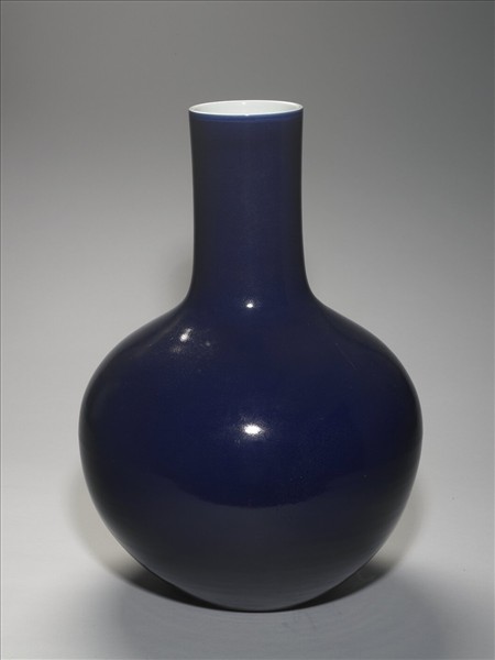 圓口直頸。碩腹圈足。器內白釉,器外壁滿覆霽青釉,釉色瑩亮。圈足露胎,足內白釉地青花書「大清乾隆年製」三行六字篆款。