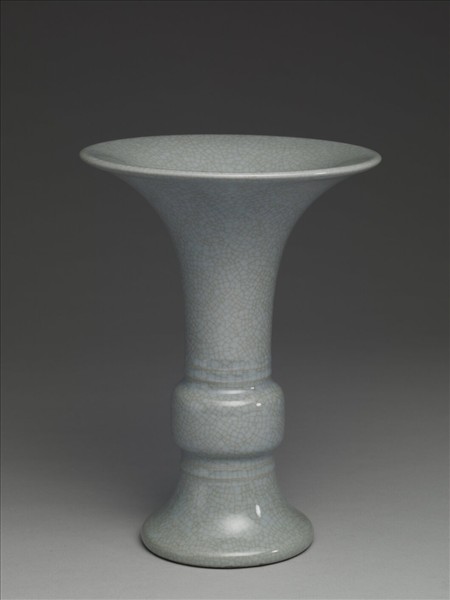 器形仿青銅器觚形,喇叭口外敞,扁鼓腹,足高且外撇。釉色淡青色帶灰,釉汁瑩厚,全器滿佈細小開片。腹部上下各飾弦紋二道。圈足塗淺赭色護胎釉,足內滿施淡青色帶灰釉,並有「大清乾隆年製」青花六字篆款。