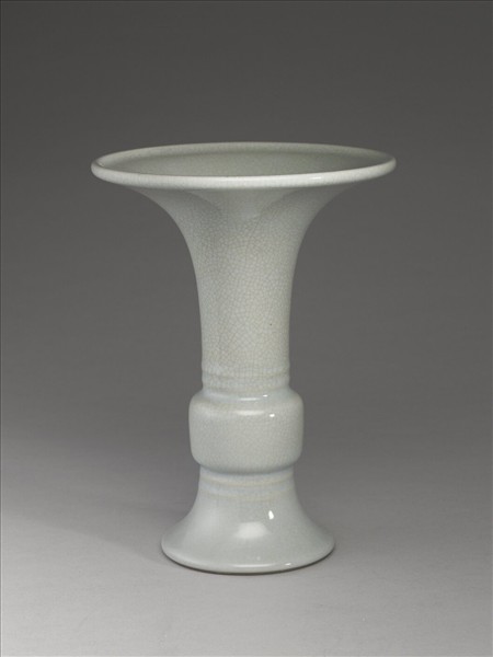 器形仿青銅器觚形,喇叭口外敞,扁鼓腹,足高且外撇。釉色淡青色帶灰白,釉汁瑩厚,全器滿佈細小開片。腹部上下各飾弦紋二道。圈足塗淺赭色護胎釉,足內滿施淡青色帶灰白釉,並有「大清乾隆年製」青花六字篆款。