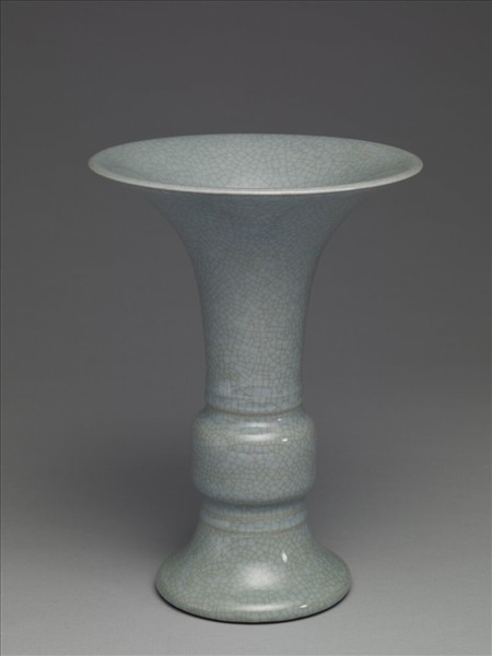 器形仿青銅器觚形,喇叭形口,器口薄且外敞,鼓腹,足高且外撇。釉色灰藍,釉汁瑩厚,全器滿佈細小開片。腹部上下各飾弦紋二道。圈足塗淺赭色護胎釉,足內滿施灰藍釉,並有「大清乾隆年製」青花六字篆款。
