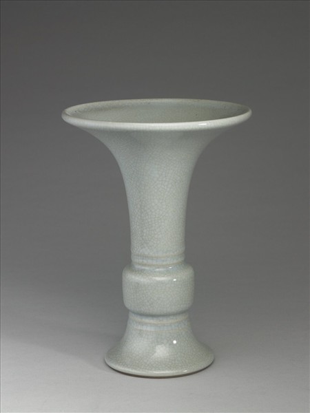 器形仿青銅器觚形,喇叭口外敞,鼓腹,足高且外撇。釉色淡青色帶灰,釉汁瑩厚,全器滿佈細小開片。腹部上下各飾弦紋二道。圈足塗淺赭色護胎釉,足內滿施淡青色帶灰釉,並有「大清乾隆年製」青花六字篆款。
