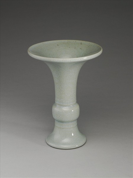 器形仿青銅器觚形,喇叭口外敞,圓鼓腹,足高且外撇。釉色淡青色帶灰,釉汁瑩厚,全器滿佈細小開片。腹部上下各飾弦紋二道。圈足塗淺赭色護胎釉,足內滿施淡青色帶灰釉,並有「大清乾隆年製」青花六字篆款。