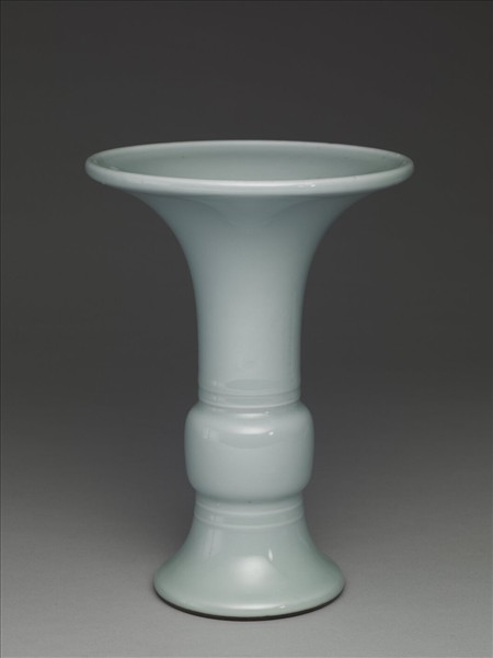 器形仿青銅器觚形,喇叭形口,短頸,鼓腹,足高且外撇。通體施淡青色釉,釉汁瑩厚。腹部上下各飾弦紋二道。圈足露胎,塗深褐色護胎汁,足內滿施青釉,並有「大清乾隆年製」青花六字篆款。