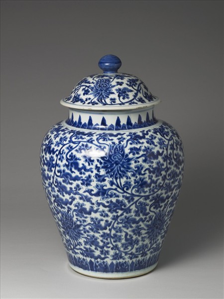 青花蓋罐,直口,短直頸,鼓肩下斂,平底,口緣有傷。腹外壁滿飾卷枝番蓮花葉,大小葉片弧形翻卷的外型,有如滿布空中的祥雲,蓋外壁的裝飾亦與之相似,是本器裝飾的主調。器頸與足處繪變形蓮瓣紋一周。底外露胎,無款識。應是件燒製於清代的作品。