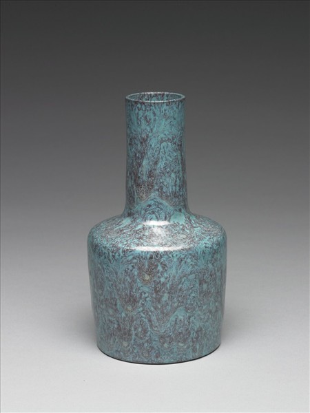 紙搥瓶。圓口,長直頸,折肩,腹壁深而直,近底處稍斂,平底內凹成足。外壁施爐鈞釉,釉面深藍和淺藍偏湖綠的呈色,猶如兩種水面的色塊彼此交匯融溶,交織出爐鈞釉特有的斑斕視覺意象。底部滿釉,僅足緣露胎一圈塗褐色護胎汁,足內模印「雍正年製」雙行四字篆款。
