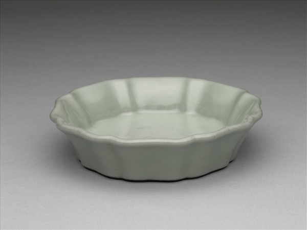 花式洗,口外侈圓唇,深壁下斂,平底。口作八瓣花口,器外壁亦隨之凹凸,將外壁分為八片接連一周的花瓣。器內外罩粉青釉,釉質凝潤,並見細開片紋,口唇與凸棱的釉層相對薄而胎色透出成暗色邊。平底內凹為足,呈深褐色,略有官窯紫口鐵足的意向,外底寬平滿釉,中央青花書「大清乾隆年製」三行六字篆款。