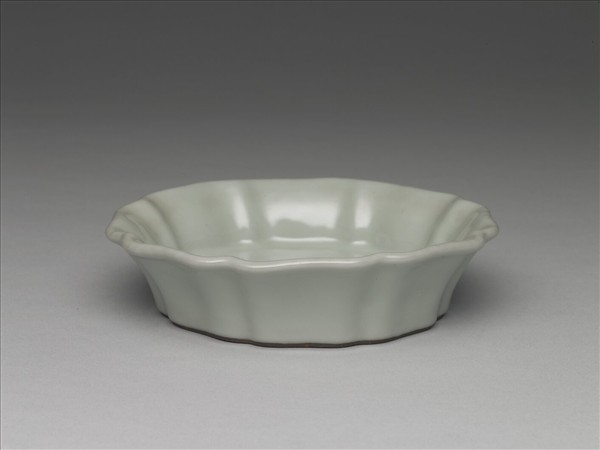 花式洗,口外侈圓唇,深壁下斂,平底。口作八瓣花口,器外壁亦隨之凹凸,將外壁分為八片接連一周的花瓣。器內外罩粉青釉,釉質凝潤,並見細開片紋,口唇與凸棱的釉層相對薄而胎色透出成暗色邊。平底內凹為足,呈深褐色,略有官窯紫口鐵足的意向,外底寬平滿釉,中央青花書「大清乾隆年製」三行六字篆款。