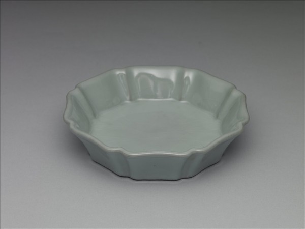 花式洗,口外侈圓唇,深壁下斂,平底。口作八瓣花口,器外壁亦隨之凹凸,將外壁分為八片接連一周的花瓣。器內外罩粉青釉,釉質凝潤,並見細開片紋,口唇與凸棱的釉層相對薄而胎色透出成暗色邊。平底內凹為足,呈深褐色,略有官窯紫口鐵足的意向,外底寬平滿釉,中央青花書「大清乾隆年製」三行六字篆款。
