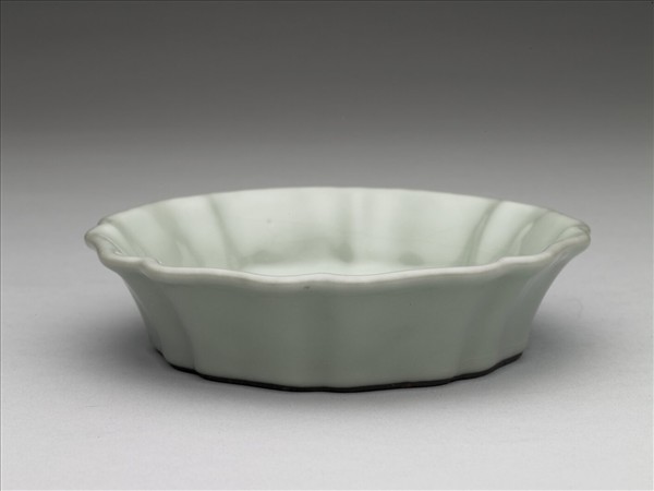 花式洗,口外侈圓唇,深壁下斂,平底。口作八瓣花口,器外壁亦隨之凹凸,將外壁分為八片接連一周的花瓣。器內外罩粉青釉,釉質凝潤,並見細開片紋,口唇與凸稜的釉層相對薄而胎色透出成暗色邊。平底內凹為足,呈深褐色,略有官窯紫口鐵足的意向,外底寬平滿釉,中央青花書「大清乾隆年製」三行六字篆款。