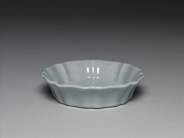 花式洗,口外侈圓唇,深壁下斂,平底。口作八瓣花口,器外壁亦隨之凹凸,將外壁分為八片接連一周的花瓣。器內外罩粉青釉,釉質凝潤,並見細開片紋,口唇與凸稜的釉層相對薄而胎色透出成暗色邊。平底內凹為足,呈深褐色,略有官窯紫口鐵足的意向,外底寬平滿釉,中央青花書「大清乾隆年製」三行六字篆款。