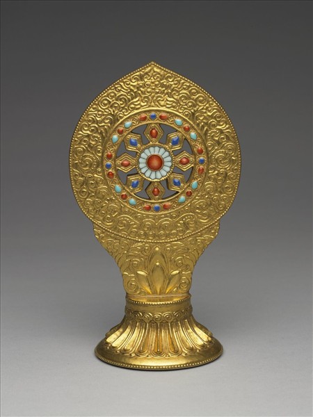 本器瓷質印花,以模仿嵌寶石的金屬法輪供具。上部片狀,外廓為尖葉形,以蓮瓣托之,印飾卷草葉紋,其中心為鏤空輪形,具八個輪輻。輪軸、輪輻、輪廓以紅、藍、綠三色琺瑯彩點飾,彩料突出,望之宛如鑲嵌珊瑚、松石、青金石等半寶石於其上,再加上醒目的金彩為底,更添莊嚴燦爛的效果。下半部是須彌台座,圈足外撇,外壁模印淺浮雕覆蓮瓣紋,足端露白胎,座內亦施金釉,並以另色金彩書:「大清乾隆年製」三行六字篆款。