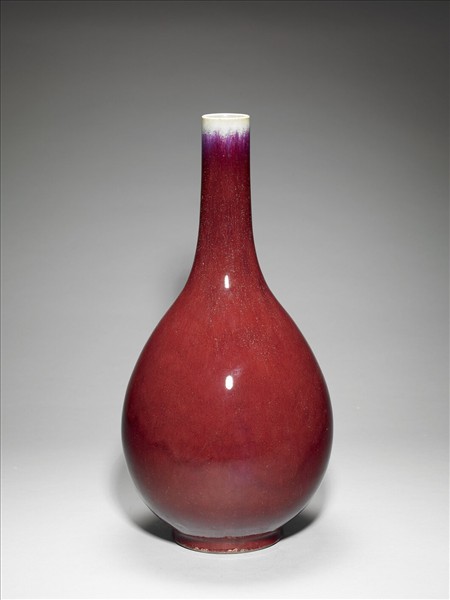 小口,細長頸,斜肩,梨形腹,圈足。全器施爐鈞釉,瓶口釉薄色白,瓶身呈紅色,靛、紫細紋斑駁流動。足底露胎,塗赭色護胎汁。器底施醬釉,底心印有「大清乾隆年製」六字三行篆書款。仿鈞窯變釉為雍正時出現的新品種,係仿鈞釉色繁衍而來,採多次施釉,燒成過程中,不同金屬元素自然結合,所產生的流動窯變釉色,一般偏紅者,稱「火焰紅」。