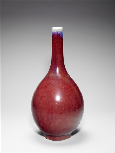 小口,細長頸,斜肩,梨形腹,圈足。全器施爐鈞釉,瓶口釉薄色白,瓶身呈紅色,靛、紫細紋斑駁流動。足底露胎,塗赭色護胎汁。器底施醬釉,底心印有「大清乾隆年製」六字三行篆書款。仿鈞窯變釉為雍正時出現的新品種,係仿鈞釉色繁衍而來,採多次施釉,燒成過程中,不同金屬元素自然結合,所產生的流動窯變釉色,一般偏紅者,稱「火焰紅」。