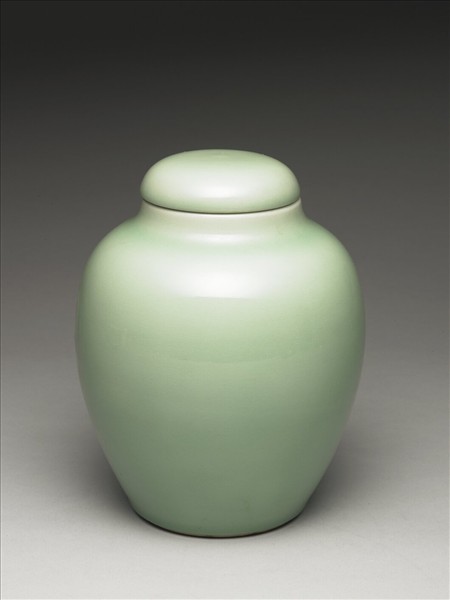 圓口,深腹,平底,凹足,帶一圓頂子母口蓋,兩側有一半圓形線狀裝飾。全器施青釉,呈冬青色,釉色均勻。足底露胎,呈白色。底青花書「大清乾隆年製」六字三行篆書款。