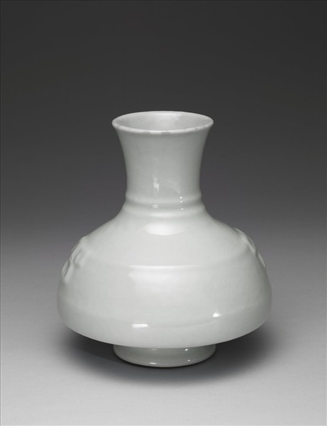 撇口,直長頸,斜肩,碩腹,雙暗環耳,下端折入成平底,下接圈足。頸部及腹部飾數道凸弦紋,全器施仿汝青瓷釉,呈淡青色,釉面佈滿淺色開片紋。足底緣露胎,塗赭色護胎汁。底以青花書「大清雍正年製」六字三行篆書款。