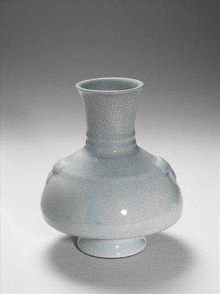 撇口,直長頸,斜肩,碩腹,雙暗環耳,下端折入成平底,下接圈足。頸部及腹部飾數道凸弦紋,全器施仿汝青瓷釉,呈粉青色,釉面佈滿淺色細密開片紋。足底緣露胎,塗赭色護胎汁。底以青花書「大清雍正年製」六字三行篆書款。